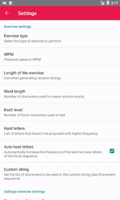 - the auto hard-letters feature automatically increases the frequency of the letters last added to the Koch exercise