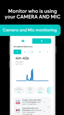 Control your privacy by tracking apps accessing your camera and microphone. Block or mute them for enhanced security.