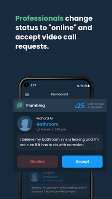 The cost of the call is based on 15-minute intervals and depends on the industry. For example, the rate to speak with a plumber may be $20 per 15 minutes. So a 15-minute call will cost $20 and a 30-minute call will cost $40. The 15-minute rate is clearly visible when selecting the industry and submitting a request. The 15-minute rates are intended to help customers save money from having a professional physically go to the customer's location while saving time from scouring the internet only to find a partial answer or solution.